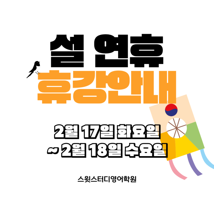 설 연휴 휴강 안내 설 연휴로 인해 2월 17일(화) ~ 2월 18일(수) 수업이 휴강됩니다. 연휴 이후 정상 수업 진행됩니다. 행복한 설 연휴 보내세요 – 스윗스터디영어학원 – <img src="https://blogthumb.pstatic.net/MjAyNjAyMTBfMTc1/MDAxNzcwNjU3NzE0NzE3.2w7_ZyembESZE8YuPSuIvvLYw7XKNiirU7CpOsTFgwMg.jGIvl0hY1IJdZeCVIpen6KqFnasrnbdJdfCMyYP24zcg.PNG/%C0%CF%C1%A4%B0%F8%C1%F6.png?type=s3" />