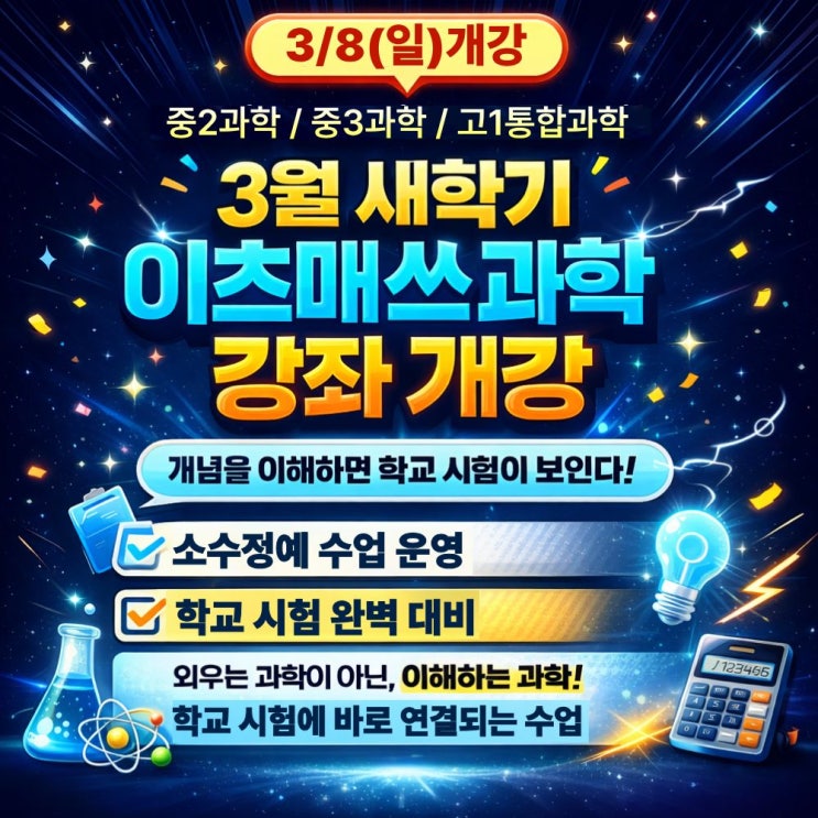 봄학기 이츠매쓰 과학 강좌 개강 안내 3/8(일) 개강 중2 · 중3 · 고1 통합과학 3월 새학기, 과학은 첫 단원에서 방향이 결정되는 과목입니다. 이츠매쓰학원은 외우는 과학이 아닌 ‘이해하는 과학’, 그리고 학교 시험에 바로 연결되는 수업으로 3월 새학기 과학 강좌를 개강합니다. ──────────────── 개강 과목 안내 중2 과학 중3 과학 고1 통합과학 학교별 진도와 내신 출제 흐름을 반영하여 각 학년에 맞춘 수업으로 진행됩니다. ──────────────── 이츠매쓰 과학 수업의 특징 개념을 이해하면 학교 시험이 보입니다. 개념 → 문제 → 시험 적용까지 끊어지지 않는 흐름으로 수업합니다. 학교 시험 완벽 대비....... <img src="https://blogthumb.pstatic.net/MjAyNjAyMTBfMjg1/MDAxNzcwNzAzNjkxNDY5.AhbkXfc5dBF10dh6z9r_Y8UXQ3snQtNUJU_IJ_q1n3kg.VfyD12yxBBKW1sV6_WsfQe4BOLznweuvjqhnUU3pIN8g.JPEG/%BA%BD%C7%D0%B1%E2%B0%ED%C7%D0%B0%B3%B0%AD.jpg?type=s3" />