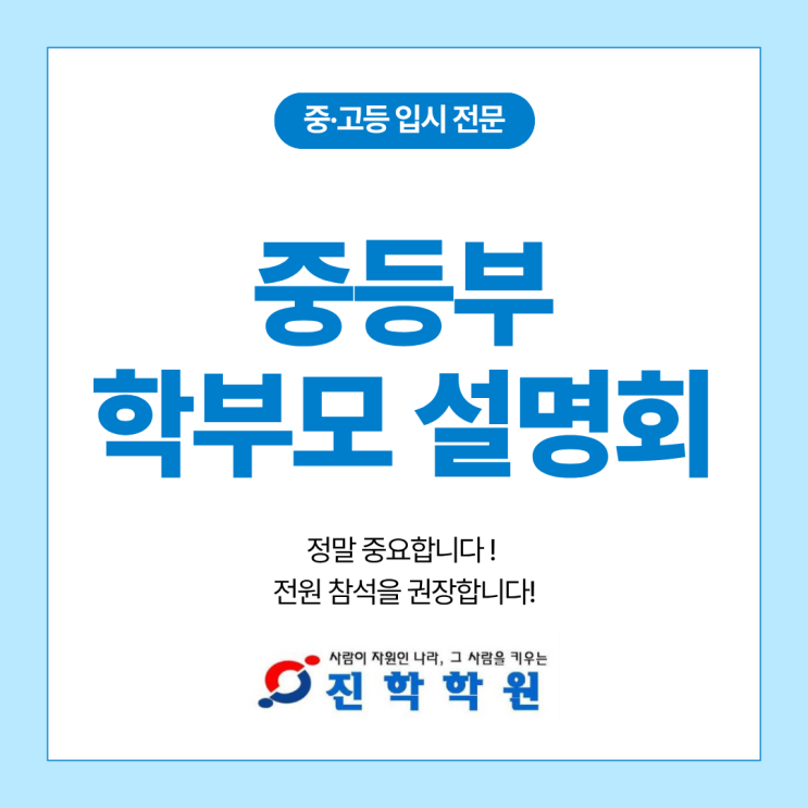 안녕하세요. 진학학원입니다. 중학교 입학을 앞두고 있는 중1, 본격적인 시험이 시작되는 중2, 앞으로 고입까지 1년 남은 중3까지 중학교 생활은 성적 관리의 시작이자, 고입·대입의 방향이 처음 결정되는 시기입니다. 특히 중1~중3 시기에는 ✔ 학년별로 반드시 준비해야 할 포인트 ✔ 중학교 성적이 고등학교, 대입으로 어떻게 연결되는지 ✔ 지금 놓치면 나중에 되돌릴 수 없는 준비 요소들이 분명히 존재합니다. 이에 진학학원에서는 중1~중3 학부모님을 대상으로 각 학년별 준비 전략과 중학교를 넘어 고입·대입까지 이어지는 현실적인 로드맵을 안내드리는 학부모 설명회를 진행하고자 합니다. 이번 설명회는 ▶ 특정 학생만을 위한 자....... <img src="https://blogthumb.pstatic.net/MjAyNjAyMDZfMTQ3/MDAxNzcwMzcyODA1Njc0.d03kS24WVFEgnuRP08vS7ugY5MJ5L7IvXz1mh5BIS2Qg.jsIsZib7zgsJHyJWoNx9UhBY3gD9KWqTSD88SfC_s88g.PNG/%BA%ED%B7%CE%B1%D7_%BD%E6%B3%D7%C0%CF_%282%29.png?type=s3" />