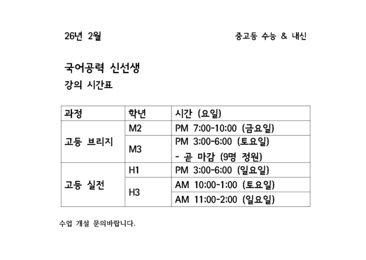 2026년 1학기 수학/영어/과학/국어 시간표(초/중등부)