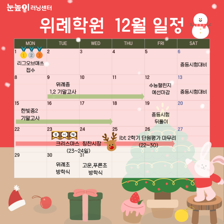 안녕하세요!! 눈높이 러닝센터 위례학원입니다! 연말을 맞아 학생들의 학습 마무리와 다양한 이벤트가 함께하는 12월 월간 일정을 안내드립니다. 아래 내용을 참고하시어 학습 계획에 차질 없도록 확인 부탁드립니다 ✅ 1일(월) ~ 31(수) 리그 오브 매쓰 접수 올 겨울방학에도 어김없이 찾아온 리그 오브 매쓰 공부하면 포인트가 쑥쑥!! 쑥쑥 쌓은 포인트로 선물 찜~~ ✅ 6일(토), 13일(토) 중등 기말시험 대비 수업 중등 친구들은 토요일에도 쉴 수가 없어요 ㅜㅜ 그렇지만 25년 마지막 시험의 성공을 위해 힘내보자!!!! 8일(월) ~ 12일(금) 위례중 1·2 기말고사 대비 기간 15일(월) ~ 19일(금) 한빛중 2 기말고사 대비 기간 ?....... <img src="https://blogthumb.pstatic.net/MjAyNTEyMDhfMjA0/MDAxNzY1MTY3MzA5OTA1.9fjyj4gu-f1wwPrmK8q1NimN0hZnFoD4stneuOnez7Mg.Rw6s0MxyyyAtWaLC7s_fkAUDGpQF0kfR2Ys4AiN0Nlwg.PNG/KakaoTalk_20251128_144353655_05.png?type=s3" />