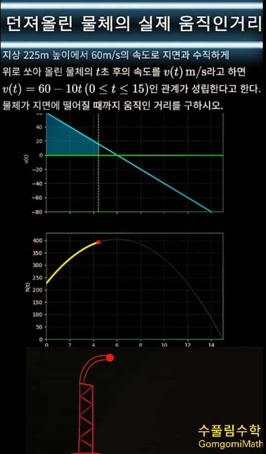 위로 던진 물체는 단순히 올라간 높이만큼만 움직이지 않습니다. 속도 그래프의 면적이 ‘이동거리’가 되는 원리를 시각화로 직관적으로 이해하는 시간. 225m 높이에서 출발한 물체가 실제로 얼마나 움직이는지 함께 살펴봅니다. 던져올린 물체, 실제로는 얼마나 더 움직일까? 225m 높이의 단상에서 60m/s로 위로 던진 물체는 올라갔다가 다시 내려오면서 지면까지 도달합니다. 많은 학생들이 “올라간 만큼만” 움직였다고 생각하지만, 전체 이동거리는 위로 간 거리 + 아래로 떨어진 거리 두 부분을 모두 포함합니다. 이번 시각화 영상에서는 속도 함수 v(t)=60−10t 속도–시간 그래프의 면적 최고점에서의 정지 순간 단상을 지나 다시....... <img src="https://blogthumb.pstatic.net/MjAyNTEyMTJfMjY0/MDAxNzY1NTEwNTU1ODg2.sRo5KV4YfGlGMjDQYZVnxhUPm0siL6XbgFvh3V849awg.bDwVj9lQTOARxUem96I4VaeQgzE-wgStCOihvodMmGgg.PNG/%BA%ED%B7%CE%B1%D7.PNG?type=s3" />