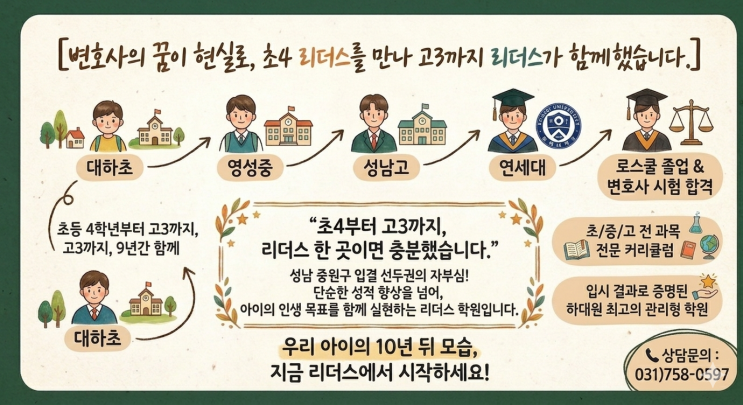 리더스에서 보낸 9년의 시간이 한 아이의 인생을 바꿨습니다. 안녕하세요, 하대원동에서 아이들의 미래를 함께 고민하는 리더스 학원입니다. 오늘은 우리 학원의 아주 기쁜 소식을 전해드리려고 합니다. 초등학교 4학년 때 처음 만나 고등학교 3학년 졸업할 때까지, 무려 9년이라는 긴 시간 동안 저희 리더스 학원과 함께했던 학생이 기쁜 소식을 들고 찾아왔습니다. 성장 경로: 대하초 ➔ 영성중 ➔ 성남고 ➔ 연세대 ➔ 로스쿨 졸업 및 변호사 시험 합격 이 학생은 초등 시절 기초를 다지는 시기부터 고등 입시의 치열한 순간까지, 단 한 번의 흔들림 없이 리더스의 시스템을 믿고 따라와 주었습니다. 성남 중원구 안에서도 선두권을 자부하는....... <img src="https://blogthumb.pstatic.net/MjAyNjA0MzBfMjA0/MDAxNzc3NTE2NzkxNzM1.EDkHve9gfeJfjTUa-gwd3b7ixBBAdM6HowazCuNJzkgg.2wTVym_eSN56Xv07oBWNoSfnsxABlKvytcBnoxcqhwAg.PNG/Gemini_Generated_Image_t96yb1t96yb1t96y.png?type=s3" />