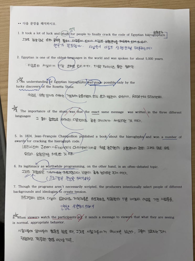 중1·중2 영어, 왜 문장 해석부터 잡아야 할까요? 문법의탑 영어학원이 해석을 손으로 써보게 하는 이유 안녕하세요. 문법의탑 영어학원입니다. 중1, 중2 학부모님들과 상담을 하다 보면 가장 많이 듣는 말이 있습니다. “단어는 외우는 것 같은데 점수가 잘 안 올라요.” “문법도 배웠는데 해석이 잘 안 된다고 해요.” “영어 공부를 하고 있는데 시험 점수는 그대로예요.” 특히 수내중 영어, 내정중 영어를 준비하는 학생들 중에는 문법은 어느 정도 공부했는데도 막상 시험에서 문장을 정확히 읽지 못해 점수가 정체되는 경우가 많습니다. 그래서 문법의탑 영어학원에서는 문법 설명만 하고 끝내는 수업이 아니라, 학생이 문장을 직접 해석....... <img src="https://blogthumb.pstatic.net/MjAyNjAzMTNfMzIg/MDAxNzczMzY4OTA2MzE3._FblH_CtwKuKbl5xnR_aDbwCrc0cNgoa4tKqVQn1OJkg.T8xpOe5fbB1zbcMvAN9tnSBfqJC-FNxUDqptS71suUIg.JPEG/KakaoTalk_20260313_112742815.jpg?type=s3" />