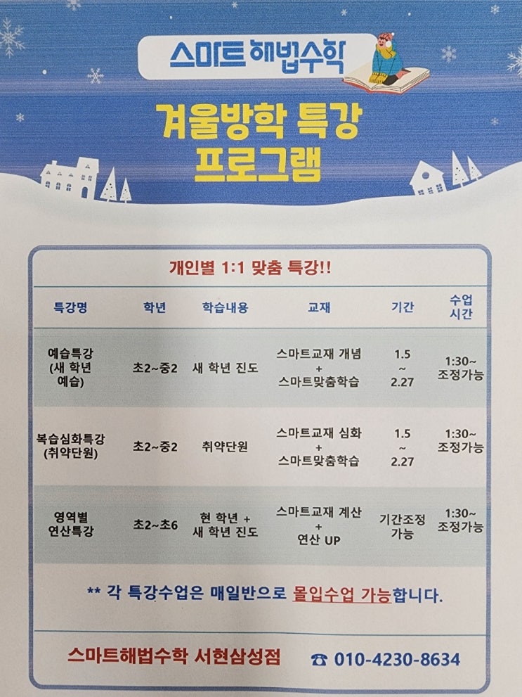 이번 겨울방학도 각자 필요한 수업으로 몰입하여 수학의 허들을 뛰어넘는 좋은 기회로 활용하면 좋겠습니다. 많은 신청바랍니다~ <img src="https://blogthumb.pstatic.net/MjAyNTEyMDhfMTQg/MDAxNzY1MTk3OTExNDQw.AwR4fOsYYpg54bryeuaB26A1zAqhySgWvP32hGBn2NEg.X5n8ofdc9JIpTcIPaaDpvxYBXAjKMthm7GfQ8qBu4Hcg.JPEG/900%A3%DF20251208%A3%DF182357.jpg?type=s3" />