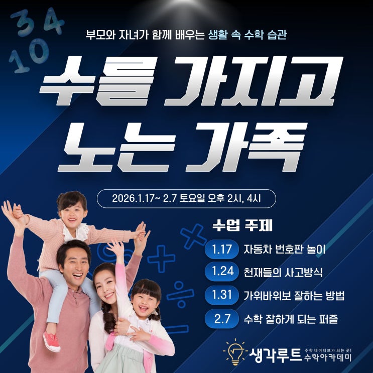 안녕하세요! 생각루트 수학아카데미입니다! 방학동안 주1회반이 없어서 아쉬우셨던 분들, 아이들이 일상에서 수학을 활용하고 익혀가도록 도와주고 싶은데, 방법을 잘 모르셨던 분들에게 좋은 소식을 들고 왔습니다! 그건 바로바로 '수를 가지고 노는 가족'!! 부모님과 자녀가 함께 수업을 듣고, 일상생활에서 수학 습관을 들일 수 있도록 배워보는 시간입니다~! 혹시 학창시절 수학을 잘 못하셨어도, 전혀 문제 없으니까 걱정하지 않으셔도 되고요! 아이와 함께 재밌게 즐기면서 수를 다루는 감각을 익힐 수 있는 주제들로 준비했으니까요, 아이와 공감대도 형성하고, 앞으로 일상에서 아이에게 적절한 질문을 해줄 수 있는 좋은 계기....... <img src="https://blogthumb.pstatic.net/MjAyNTEyMDlfMTQ2/MDAxNzY1MjYxNDYxODIx.x0m-pPOCxXL8es-0i1hzMVpAH1y5HDb0huNqTf_HBvsg.BExCB9I9WGGQU1ZIaTtJs4NLe2lswhVRFCwCR-LgMcwg.JPEG/1.jpg?type=s3" />