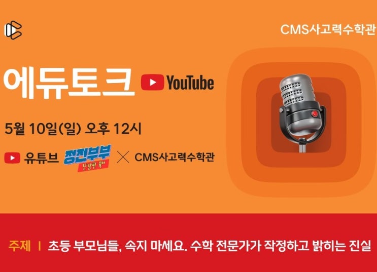 안녕하세요~ CMS 분당수내 사고력수학관입니다. '유튜버 난장판 육아 정전부부'와 'CMS사고력 원장출신'의 워킹맘이 만나 유쾌하게 교육 로드맵을 풀어가는 에듀토크~!!! 오는 5월 10일(일) 오후 12시 초등 자녀를 둔 부모님이라면 꼭 한 번 시청해 보셔야 할 에듀토크 라이브가 진행됩니다! 에듀토크 시청부터 푸짐한 이벤트 혜택까지, 이번 기회 놓치지 마세요! ▶사고력 설명회 예약 바로가기 ▶ 입학테스트 네이버 예약 바로가기 ☎ CMS분당수내 |사고력수학관 031-712-1270 #분당CMS #수내CMS #분당사고력 #분당사고력 #사고력수학 #창의사고력 #CMS #수내사고력수학 #분당초등수학 #초등수학 #수학특강 #초등교과 <img src="https://blogthumb.pstatic.net/MjAyNjA0MjhfMjEg/MDAxNzc3MzUxNzYzMjI2.GPo30VnDE-RI3eSa7x3EKIOLSVGdU1J4WDQchyAyQrwg.fLtHh0WfRhP7Zd-sd6bo8Qq4EO5cxy8J48cXhBZIc-4g.JPEG/%BF%A1%B5%E0%C5%E4%C5%A9.jpg?type=s3" />