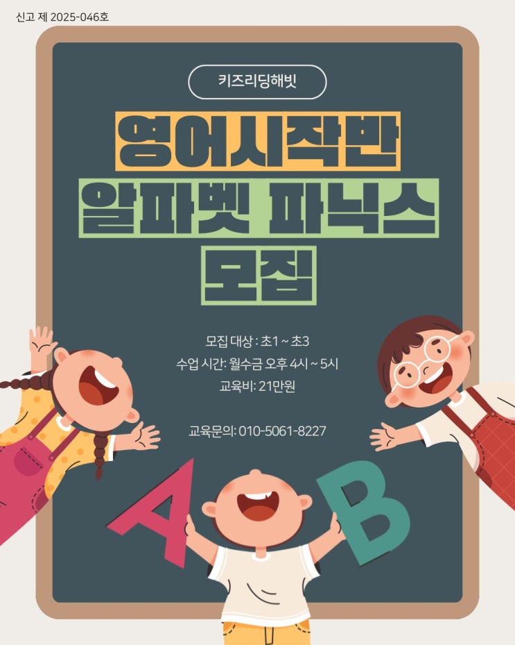 안녕하세요. 프리미엄 영어교육을 돕는 헤라입니다. 개학을 시작하며 초등 영어 첫 시작을 하는 영어시작반 알파벳 파닉스 수업 모집 안내드립니다. 초등 저학년 영어를 처음 시작하는 아이들이 참여할 수 있는 수업입니다. 모집대상: 초1 ~ 초3 수업시간: 월수금 오후 4시 ~ 5시 교육비: 21만원 키즈리딩해빗 파닉스 수업에서는 알파벳 음가를 익히고, 단어를 읽으며, 배운 알파벳 음가를 통한 문장 읽기까지 가능하게 할 수 있도록 지도 하고 있습니다. 키즈리딩해빗 알파벳 파닉스 수업을 들은 아이들은 5개월 후 영어책을 소리내어 읽으며 영어 이야기와 함께 유의미한 파닉스 연습을 할 수 있도록 지도하고 있어요. 항상 아이들이 파닉스 수....... <img src="https://blogthumb.pstatic.net/MjAyNjAyMjRfMTk3/MDAxNzcxOTM2OTU3MjQ0.mmFXT76tLZTKNQHqkOfcnfKhO0w_-8Zpc5GTGmNneVEg.A_IFKYlMtoOVTyi6YgnLcdHqVRzrBGhnKEkPIn5WdB4g.JPEG/%C4%C3%B7%AF%C7%AE_%B1%CD%BF%A9%BF%EE_%C0%CF%B7%AF%BD%BA_%BE%EE%B8%B0%C0%CC_%BF%B5%BE%EE_%B1%B3%BD%C7_%C0%CE%BD%BA%C5%B8%B1%D7%B7%A5_%B0%D4%BD%C3%B9%B0__%282%29.jpg?type=s3" />