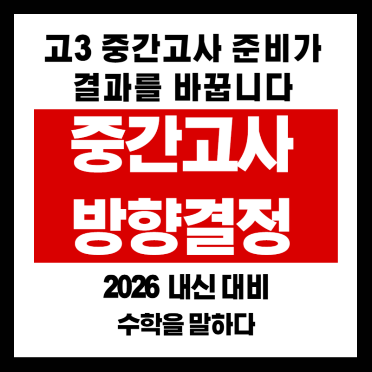 안녕하세요 수학을말하다 입니다 3월 학평이 끝났습니다 이제 바로 중간고사입니다 고3 1학기 중간고사는 그냥 시험이 아니라 학기 전체 방향을 정하는 시험입니다 3학년 1학기 1차 정기시험은 대부분 학교에서 내신의 30% 이상을 차지합니다 한 번의 시험으로 학기 성적의 방향이 결정됩니다 대학마다 반영 방식은 다르지만 3학년 1학기 일부 과목 성적이 합불에 직접적인 영향을 주는 경우도 많습니다 그래서 이 시기는 가볍게 넘길 수 있는 시험이 아닙니다 내신은 수능이 아닙니다 출제자는 학교 선생님입니다 문제집보다 수업이 먼저입니다 교과서, 프린트, 필기 여기서 거의 나옵니다 중하위권은 단순하게 가야 합니다 수업 내용 정확히 정....... <img src="https://blogthumb.pstatic.net/MjAyNjA0MjBfMTAy/MDAxNzc2Njc1NzQ0MzUz.kyJnUaYqhP-FAm8g3bHim0cKp0iX0lzJaKKM22RTzaAg.1spSBl6r5DVoY5hQslNtIbU1GqLJ32zyAYDrzCO5Jgsg.PNG/%C1%A6%B8%F1%C0%BB_%C0%D4%B7%C2%C7%D8%C1%D6%BC%BC%BF%E4_-001_%2816%29.png?type=s3" />
