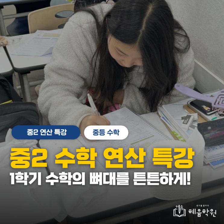 안녕하세요, 혜윰학원입니다! 중학교 2학년은 1학년 때와 달리 본격적인 지필고사와 수행평가가 시작되어 아이들이 학업적인 부담을 처음으로 느끼는 시기입니다. 학사 일정의 템포가 빨라지는 것은 물론, 특히 1학기에 배우는 부등식과 방정식은 수학의 핵심 뼈대가 되는 아주 중요한 단원입니다. 새 학기 시작 전, 우리 아이들이 수학에 자신감을 가질 수 있도록 준비한 '중2 연산 특강' 수업 현장을 공유합니다! 1주차 : 부등식의 첫걸음 중2 수학의 시작인 부등식, 기초부터 탄탄하게 다지는 시간을 가졌습니다. 교재: 「개념+연산 중학수학 2-1」 학습 내용: 부등식의 정의부터 성질까지 원리를 차근차근 이해하고....... <img src="https://blogthumb.pstatic.net/MjAyNjAxMTlfMiAg/MDAxNzY4ODAwNDk5ODA4.wCQDWc0U_eU2_B8ewOaO266G5cCnO9Ae9kVGEm_BTgQg.FFLtpJG-nGJDO_R4OYKPiucM8jZiZPdaX1dkgw-C0P0g.PNG/%C1%A6%B8%F1%C0%BB_%C0%D4%B7%C2%C7%D8%C1%D6%BC%BC%BF%E4_-012.png?type=s3" />