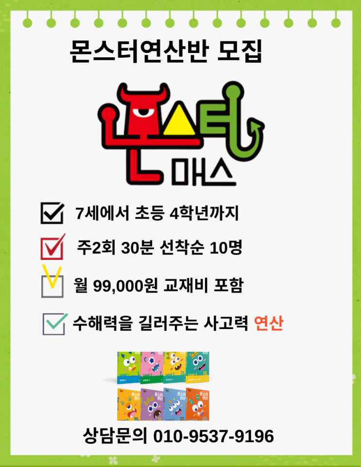 연산이 약한 아이, 방법이 다르면 달라집니다 ✅️ 몬스터 연산반 모집 안내 요즘 연산은 단순 계산 속도만으로 평가하지 않습니다. 이해하고 구조를 파악하며 푸는 연산, 즉 사고력 기반 연산이 중요해졌습니다. 그래서 준비했습니다. 풀면서 생각하는 힘을 키우는 몬스터 연산 프로그램 몬스터연산은 무엇이 다른가요? 몬스터연산은 단순 반복 계산이 아니라 수학적 문해력을 키우는 연산 프로그램입니다. ✔ 수 감각 형성 ✔ 수 개념 이해 ✔ 수직선 · 수모형 · 구조 모델 활용 ✔ 연산 알고리즘 구조화 ✔ 단계별 자동화 훈련 아이들이 “왜 이렇게 계산하는지”를 이해하면서연산 실력과 사고력이 함께 자랍니다. 몬스터 연산반 모집 내....... <img src="https://blogthumb.pstatic.net/MjAyNjAyMDhfMTY3/MDAxNzcwNTUwMzU5MjMy.dyPHm4npxOsGCp_hERzqrajlPZJt8wV5ws3m6VSh99gg.QR4oWc69NhTrCtWfGcsuwHX3lEpnntJ2ezwky5B8KZUg.PNG/900%A3%DF%C1%BE%C0%CC%C0%DA%BC%AE%BD%BA%C6%BC%C4%BF%A3%A8ppt%A3%A9.pptx%A3%DF20260208%A3%DF203121%A3%DF0000.png?type=s3" />