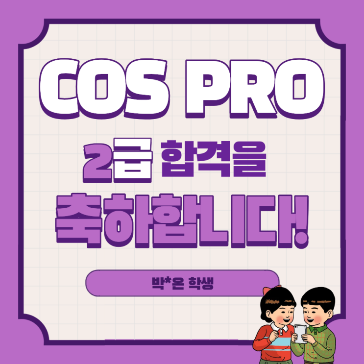 안녕하세요! 두잉창의코딩 고양입니다. 또 한 번 너무나도 기쁜 자격증 합격 소식입니다!! 이제 중학교 2학년이 되는, 성사중 1학년 박*온 학생의 COS PRO 2급 파이썬 합격, 그것도 만점 합격 소식입니다!!! 축하합니다~!! 박*온 학생은 블록코딩 정규과정으로 시작해서 코딩의 기초 개념과 사고력을 다지며 COS 자격증 1급까지 따냈는데요. 텍스트코딩을 시작하면서 파이썬으로 넘어와 COS PRO 3급 취득 후 2급까지 바로 도전하게 되었습니다. COS PRO 2급 시험은 프로그래밍 설계 및 구현 능력은 물론, 코드 이해력과 문제 해결력을 종합적으로 평가하는 시험입니다. 50분 동안 총 10문제를 해결하며 2차원 리스트, 정렬 알고리즘 등 다양한 유....... <img src="https://blogthumb.pstatic.net/MjAyNjAyMTJfMTYz/MDAxNzcwODg5OTU3NTUx.yYizizFXlmdtS4BWXYLcIJTIV9HysU0itwzcwsM4zHUg.4uwCdW3b9RIWRoe8niu8mq9C2zCzfTLfJdRCRJis8oQg.PNG/COS_PRO_2%B1%DE_%C7%D5%B0%DD_%281%29.png?type=s3" />