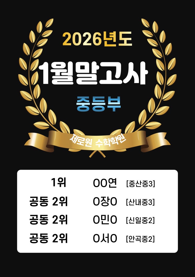 01월 15일(목), 01월 16(금), 1월 18일(일) 3일간 치러진 중등부 우수자 수상입니다. 축하드립니다^^ <img src="https://blogthumb.pstatic.net/MjAyNjAxMjBfMTY0/MDAxNzY4ODM1OTA2Njky.JUH9TNq7fXWJXPr5VG1tGCx1bdWrPTcT_4j7iABVVdcg.tIIwcw33CbA0TmeCTPli7Z1Po94AXsngh3vXa50zOJ4g.JPEG/26%B3%E21%BF%F9_%C1%DF%B5%EE%BA%CE%BC%F6%BB%F3.jpg?type=s3" />