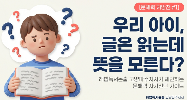안녕하세요! 해법독서논술 고양파주지사입니다. 요즘 교육계에서 가장 뜨거운 키워드는 단연 '문해력'입니다. "우리 아이는 책을 좋아해요", "문제집 읽는 데 문제없어요"라고 하셨던 학부모님들도 막상 아이와 대화를 나눠보거나 서술형 문제를 풀려보면 당황하시는 경우가 많습니다. 글자를 소리 내어 읽는 '독해'와 그 문맥을 짚어내고 의도를 파악하는 '문해'는 완전히 다른 영역입니다. 단순히 눈이 글자를 따라가는 것만으로는 '읽었다'고 할 수 없습니다. 특히 우리 고양·파주 지역은 교육열이 높고 상급 학교로 갈수록 교과 진도가 빠르며 심화 지문이 많이 등장합니....... <img src="https://blogthumb.pstatic.net/MjAyNjAxMjZfMzMg/MDAxNzY5NDM1NTE5ODQ0.fEz8nAUV9u1L02pwRTedZDJVa9uoC5DN4mU9sw0iXugg.jrCTz7YKCViLTGgskJHL3HRAfZTZRcwn9rP5MuMhGm0g.PNG/%B9%AE%C7%D8%B7%C2_%B0%C7%B0%AD_%C3%B3%B9%E6%C0%FC_1.png?type=s3" />