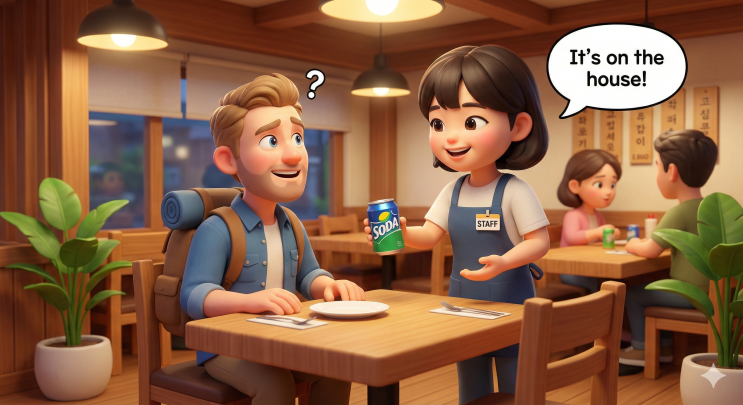 안녕하세요, 오름교육(OROMedu)입니다. 오늘은 우리가 식당이나 카페에서 자주 쓰는 말, 하지만 외국인에게 말하면 뜻이 전혀 다르게 전달되는 표현 하나를 다뤄보기로 해요! 바로 "서비스(Service)"라는 단어에요. ● "This is service!" (이거 서비스예요!) 한국 식당에서 사장님이 콜라 한 병을 내주면서 흔히 하는 말. "자, 이건 서비스예요~!" 이걸 영어로 그대로 옮기면 "Here, this is service!" ( X) 외국인들은 이 표현을 듣고 어리둥절해 할지도 몰라요... "Service? You mean… like customer service? Is there a problem?" (서비스? 고객 응대 말이야? 무슨 문제 있어?) ‘Servi....... <img src="https://blogthumb.pstatic.net/MjAyNjAxMTZfOTMg/MDAxNzY4NTQ0NTUwMDAy.by38dsRc6uLkdTXHN4fWZECH5NTRvbtA7sPV4RppgdIg.-6AQ0zNOu5sCkuEzDnQYmTUVMq1zYUxEnY2VqWG3Cr0g.PNG/Gemini_Generated_Image_s4aa3ns4aa3ns4aa.png?type=s3" />