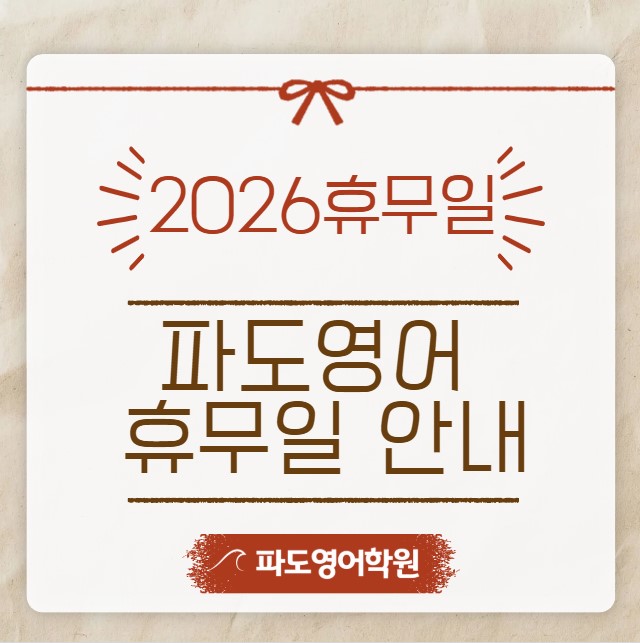 파도영어 2026년 휴무일을 알려드립니다. 공휴일 & 빨간 형광펜 부분이 2026년 휴무일 입니다. 정규생의 경우 휴무일은 미리 문자로 알려드리고, 상시 바뀔 수 있는 점 미리 알려드립니다. 문의: 031-372-8505 <img src="https://blogthumb.pstatic.net/MjAyNTExMjdfMjkg/MDAxNzY0MjIyMTY3MTM3.GtxX5AODNguul_zP85ivJkz56nLxAnpvbUxlzMCjy-Mg.c-mj8mcNm5P3yNgwsiMv8TxPZltCxlXm1zIaOGOg35Mg.JPEG/%C8%DE%B9%AB%C0%CF_%BE%C8%B3%BB.jpg?type=s3" />