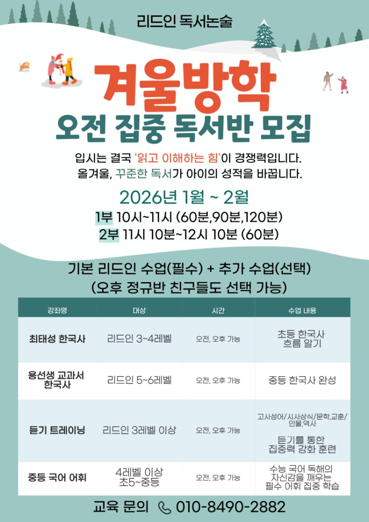 (리드인 오산시티자이점) 겨울방학 오전 집중 독서반 모집- 입시는 결국'읽고 이해하는 힘'이 경쟁력입니다!
