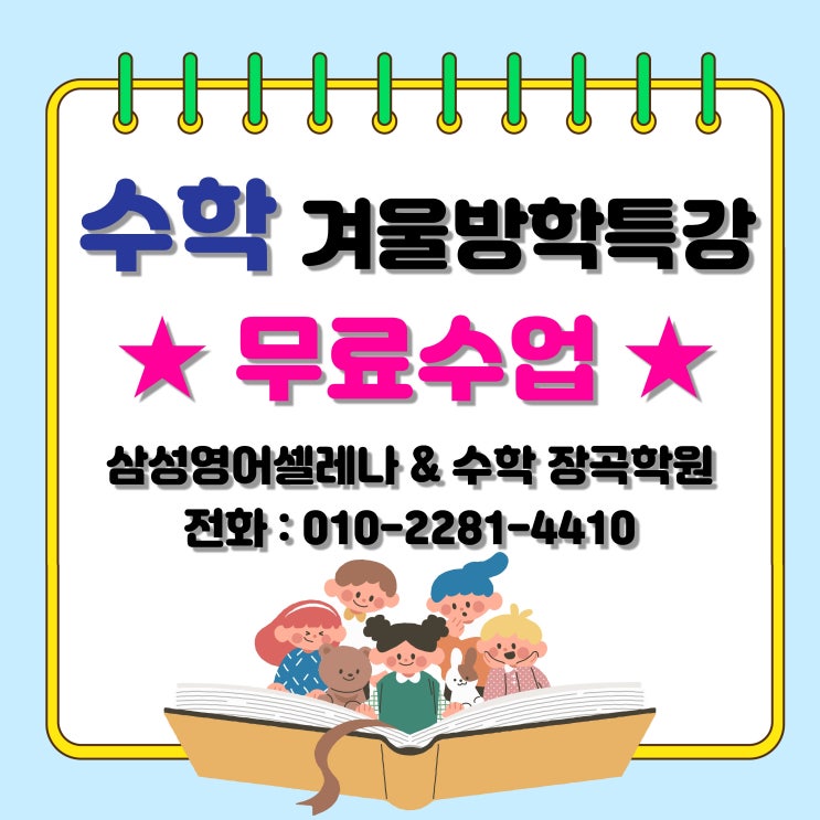 안녕하세요. 삼성영어셀레나 & 수학 장곡학원입니다. 오늘은 저희 학원의 수학 겨울방학 특강 이벤트를 전해드리겠습니다! 삼성영어 장곡학원 수학교실에서 겨울방학을 맞아 수학 겨울방학특강 무료수업을 진행합니다. (*교재비 별도) ✔ 수학 기초부터 개념·응용까지 ✔ 학년별 / 수준별 맞춤 수업 ✔ 소수정예 관리 수업 ✔ 방학 동안 학습 흐름 바로잡기 대상 초등학생 / 중학생 수업 내용 · 학년별 핵심 개념 정리 · 새 학기 대비 선행 학습 · 수학 자신감 회복 수업 ✔ 겨울방학은 ‘공부 격차가 벌어지는 시기’입니다. 1, 2월 겨울방학 두 달! 이 시기를 어떻게 보내느냐 에 따라 학습 습관과 진도, 그리고 공부의 깊이가 달....... <img src="https://blogthumb.pstatic.net/MjAyNTEyMThfNDQg/MDAxNzY2MDQxMTg3ODIy.E20aM7JxKNUBEuUd2hNUeUKWTScIt3XPtt1UiqJdxs8g.uVCTo5nh-wTwchehYmMOTqTDwjvwLBbHFXhKPXrs2bMg.JPEG/%BC%F6%C7%D0%B0%DC%BF%EF%B9%E6%C7%D0%C6%AF%B0%AD2.jpg?type=s3" />