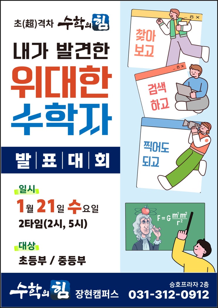 내가 발견한 위대한 수학자 발표대회 안내 수학 공식만 외우는 공부가 아니라 수학을 만든 ‘사람’을 만나는 시간을 준비했습니다. ‘이 공식은 누가 만들었을까?’ ‘이 수학자는 어떤 생각을 했을까?’ 이런 궁금증에서 출발하는 「내가 발견한 위대한 수학자」 발표대회가 열립니다! ✨ 찾아보고 · 검색하고 · 찍어도 되는 발표대회 이번 발표대회는 정답을 맞히는 대회가 아닙니다. ✔ 직접 찾아보고 ✔ 검색해보고 ✔ 마음에 드는 수학자를 골라 ✔ 나만의 시선으로 이야기하는 발표대회입니다. 뉴턴, 가우스 같은 유명한 수학자도 좋고 조금 덜 알려진 수학자도 괜찮아요. **‘내가 왜 이 수학자를 선택했는지’**가 가장 중요....... <img src="https://blogthumb.pstatic.net/MjAyNTEyMThfOTgg/MDAxNzY2MDQ4MTY4MDM5.8JEEOAfGlcgXND1ETR5lzudffZmGO8QwK1CEDSlQs4Ag.ua-o65z_xkujkEj1Y_7dOhsgcOoYsSaGUz0Y19aqP50g.JPEG/%C0%A7%B4%EB%C7%D1%BC%F6%C7%D0%C0%DA_%B1%A4%B0%ED%C1%F6.jpg?type=s3" />