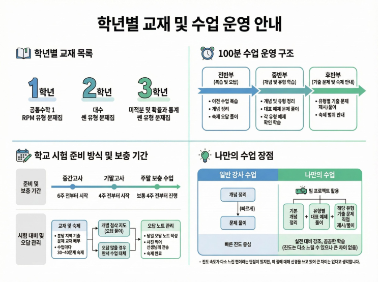 하상동수학학원 학년별 교재 및 수업 운영 안내