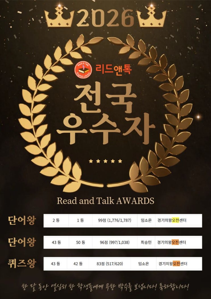 ✨ 전국 리드앤톡 우수자 탄생! 오전센터 친구들 정말 자랑스러워요 ✨ 안녕하세요, 리드앤톡 오전센터입니다 오늘은 정말 기쁜 소식을 전해드리려고 해요! 매달 리드앤톡 본사에서는 전국 단어왕 / 퀴즈왕 / 퍼즐왕을 선정하고 있는데요, 전국 리드앤톡 학생들을 대상으로 한 성과 집계라 정말 의미 있는 결과랍니다. 그런데 이번에 바로! 저희 리드앤톡 오전센터 친구들이 전국 우수자 명단에 이름을 올렸어요! 승민이의 놀라운 성과 우리 승민이는 ✔️ 단어 많이 외우기 부문 전국 50등 ✔️ 단어 테스트 점수 부문 전국 43등 이라는 정말 대단한 성적을 기록했어요 1월 한 달 동안 겨울특강까지 함....... <img src="https://blogthumb.pstatic.net/MjAyNjAyMTBfMTAy/MDAxNzcwNjkwMDU0MDU5.NqyTyamnuBUCuFSGeV22JexjDMg8_5qmKsIMAbrCqT4g.aIKMaInf35rk4BqHtUGC6xdZ2Sl4cM6ULKpjdcyeZyYg.JPEG/%C1%A6%B8%F1%C0%BB_%C0%D4%B7%C2%C7%D8%C1%D6%BC%BC%BF%E4._%2833%29.jpg?type=s3" />