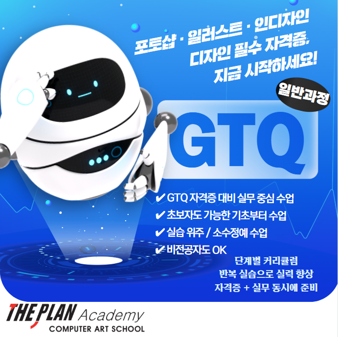 GTQ 자격증 일반과정으로 기초부터 차근차근! 디자인에 관심은 있는데 포토샵, 일러스트, 인디자인… 뭐부터 배워야 할지 막막했던 적 있으신가요? 취업 준비를 하다 보니 디자인 자격증 하나쯤은 있어야 할 것 같고, 그렇다고 혼자 독학하기엔 쉽지 않죠. 그래서 오늘은 더플랜컴퓨터아트회계학원의 GTQ 자격증 일반과정을 소개해드릴게요. ✔ 디자인 필수 자격증, GTQ란? GTQ는 그래픽 툴 활용 능력을 평가하는 디자인 분야 대표 자격증이에요. 포토샵을 시작으로 일러스트, 인디자인까지 함께 배우면 실무에서도 바로 활용할 수 있는 기본기가 탄탄해집니다. ✔ 더플랜 GTQ 일반과정이 좋은 이유 ✔ GTQ 자격증 대비 + 실무 중심 수업 ✔....... <img src="https://blogthumb.pstatic.net/MjAyNjAxMjdfMjk1/MDAxNzY5NDk3OTYwMTUx.jn15udF77SRrz4aNYKRpA5jzWaLcHfnGQ7rSsPlmge4g.n1eF3G509GQKDnAB1bWerK9-sWT0wOBu0pwQMwhJI0cg.PNG/image.png?type=s3" />