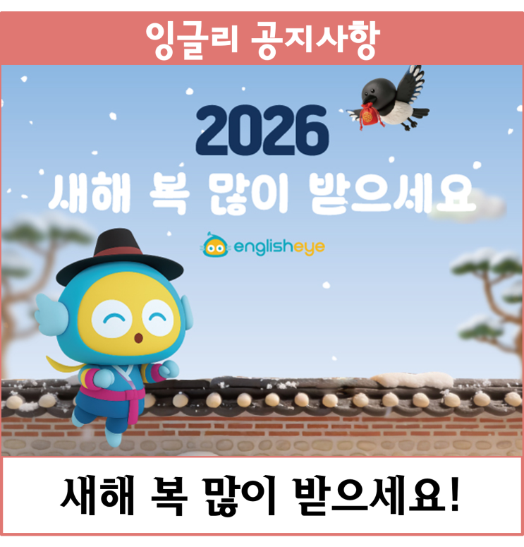 안녕하세요. 잉글리시아이입니다. 지난해 잉글리시아이에 보내주신 성원에 감사드립니다. 2026년에는 희망하시는 모든 일들이 이루어지길 바라며, 더욱더 평안하고 건강한 한 해를 보내시길 기원합니다. 앞으로도 잉글리시아이에 변치 않는 관심과 응원을 부탁드립니다. 감사합니다. <img src="https://blogthumb.pstatic.net/MjAyNjAxMzFfMjQ1/MDAxNzY5ODY4OTQyMTM0.lCDfXVT_HTDUaAjZzngBdU0L1oGoe6zNpk9YuDV_K7Yg.ye3MghRdpbJEiNO0yAwATePFNG0wFgeJAJOtUV6RdUsg.PNG/%B1%D7%B8%B21.png?type=s3" />
