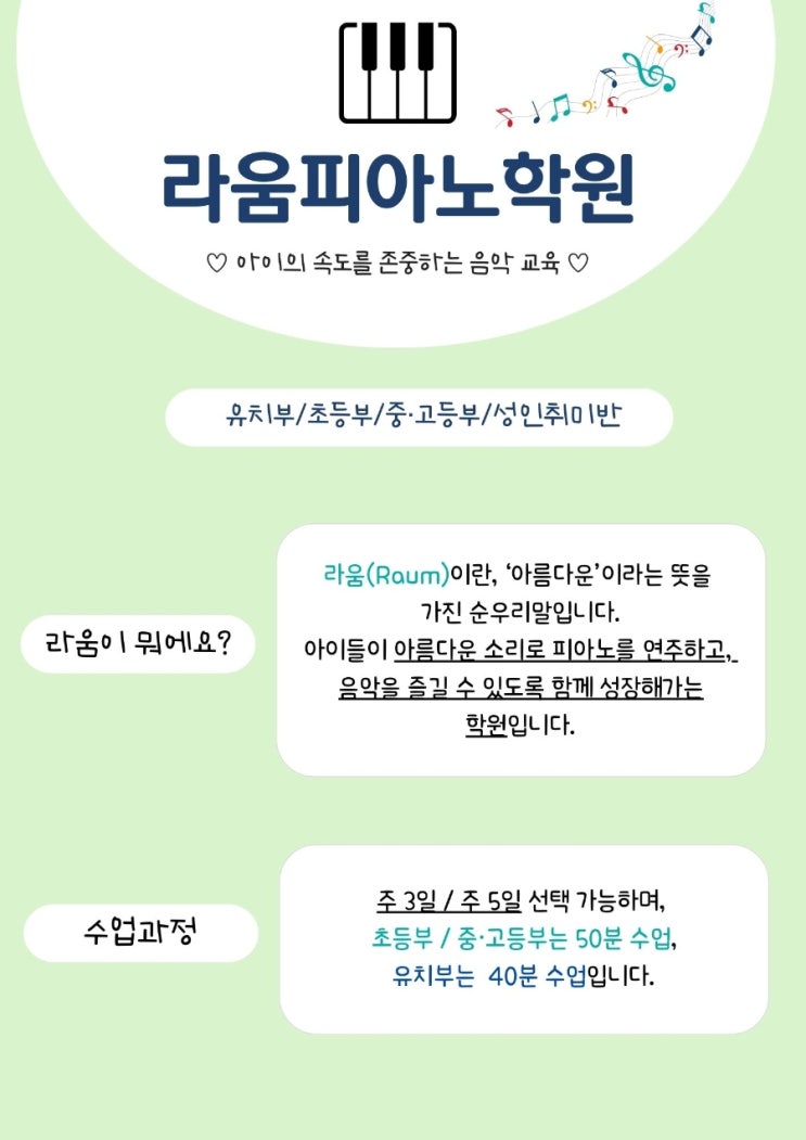 안녕하세요. 라움피아노학원입니다.^^ 2026년 라움피아노 신입생 모집안내입니다.♡ 더 궁금하신 점은 학원으로 연락주세요! <img src="https://blogthumb.pstatic.net/MjAyNjAxMTRfMTU5/MDAxNzY4MzY3NDc0ODcx.PfdC_VQKehEu7tszm63oDsnDakUp63xSyO1GEWTlwrYg.XvszrJryl9nfJc0uvt0NmCKvbg-vmufhDC-SYuAF3zEg.JPEG/900%A3%DF1.jpg?type=s3" />
