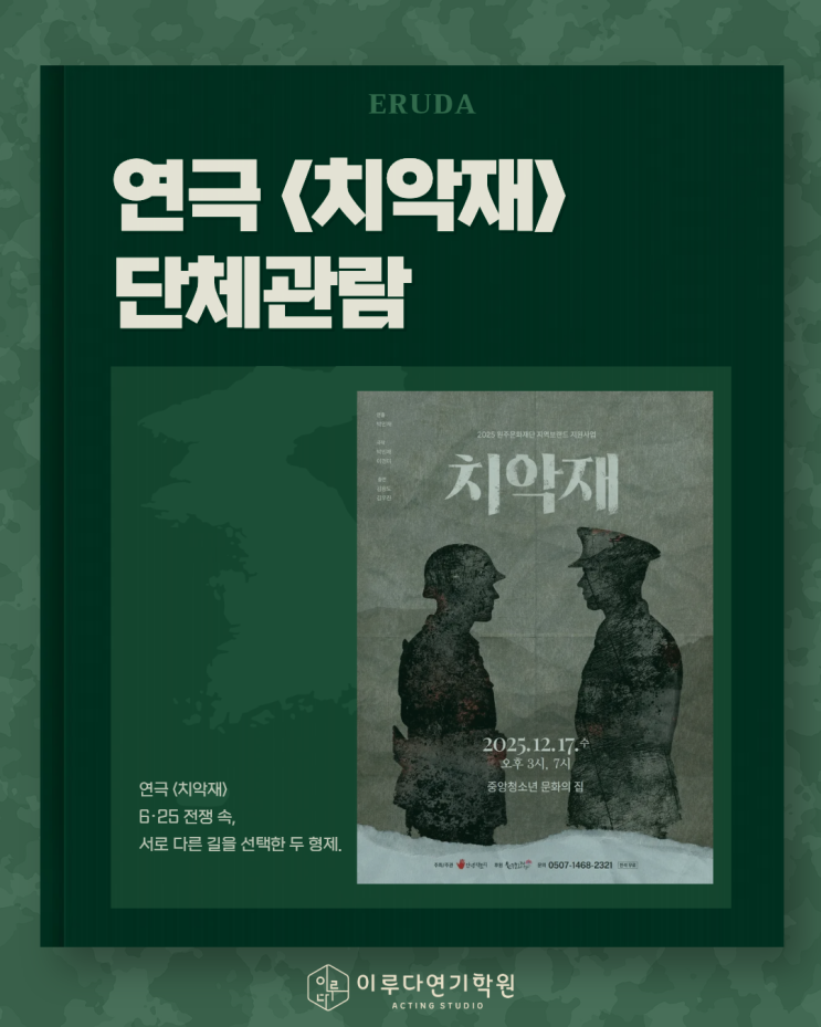 연극 <치악재>를 관람하고 온 이루다 친구들! 연극 <치악재>는 6·25 전쟁 당시 원주 치악재 고지에서 서로 다른 진영의 군인으로 다시 마주한 두 형제의 이야기를 담은 작품입니다. 전쟁 속에서 서로 다른 선택을 하게 된 형제의 마음을 따라가는 이 작품은 가족 안에 남겨진 기억과 상처를 통해 전쟁이 개인의 삶에 어떤 갈등을 남기는지를 느끼게 해주는 시간이었습니다. 미래의 배우인 우리 이루다 친구들에게 배우로서 또 한 걸음 성장할 수 있는 소중한 시간! 이루다는 앞으로도 친구들과 함께 좋은 작품들을 직접 만나고 경험해 나가겠습니다 #원주연기학원 #이루다연기학원 #강원도연기학원 #연극단체관람....... <img src="https://blogthumb.pstatic.net/MjAyNjAxMTRfODEg/MDAxNzY4MzY2NTg5Mzg4.kIa4tnlUh6_WMpi4pE8UCKQUywU7twdkd5TgVLz-4PUg.vnF_KertbVwGLmcI_uG4DoFwNpg_fbcXDsP-Cew3rLYg.PNG/1.png?type=s3" />
