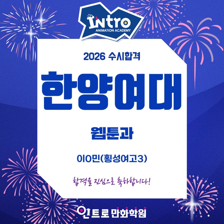 2026 한양여대 수시2차 합격 웹툰과 이0민(횡성여고3) 합격을 진심으로 축하합니다!! ★2026년 수시합격 발표중★ 높은 경쟁률 실기전형 압도적 합격!! 청강대 17.34:1 합격 공주대 35.04:1 예비합격 공주대 23.67:1 예비합격 부산대 17.83:1 합격 목원대 16.53:1 합격 호서대 17.66:1 합격 서원대 10.63:1 합격 대전대 14.00:1 예비합격 배제대 11.62:1 예비합격 대진대 12.00:1 예비합격 청강대 3명 / 상명대(서울) / 공주대2명 / 부산대 / 홍익대 / 목원대5명/ 호서대2명 / 배재대3명 중부대 / 대전대 / 예원예대 / 서원대3명 / 대진대 / 경일대4명 *전년기준 합격가능 예비번호 포함 ★2025년 단, 한해 합격★ 청강대 9명 합격(수시7명 정시....... <img src="https://blogthumb.pstatic.net/MjAyNTEyMTdfMiAg/MDAxNzY1OTQwMzY1MzU4.Jnn_AcB6tdqzmRa-i_z-85a4mO8XcbY6nhYBTurOc8wg.siyP5V3OhxYEmyVrzOou5siuhUv4pDNOG22wuwGIS2kg.JPEG/53.jpg?type=s3" />