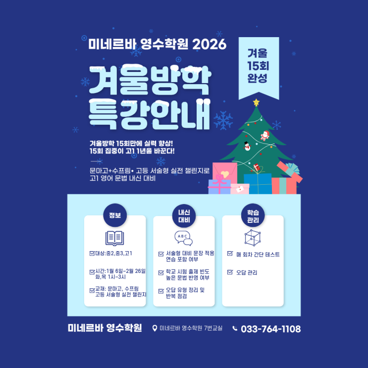 안녕하세요, 미네르바 영수학원 입니다. 이호형 선생님의 고1 영어 문법 내신 대비 겨울방학특강이 1/6 개강합니다! 1월 6일부터 2월 26일까지 화목 1시~3시에 수업이 이루어집니다. 수업은 이렇게 이루어집니다! 학년 / 대상 : 중2, 중3, 고1 학생 수업 목적 :고1 영어 문법 내신 대비 총 수업 회차 :15회차 수업 기간 : 1월 6일부터 2월 26일까지 화목 1시~3시 1. 교재안내 교재 / 자료 : 문마고, 수프림 고등 서술형 실전 챌린지 교재는 총 두권으로 이루어집니다. 2. 학습관리 및 피드백 ●매 회차 간단 테스트 ●오답 관리 3. 내신 대비 체크 포인트 ●서술형 대비 문장 적용 연습 포함 여부 ●학교 시험 출제 빈도 높은 문법 반영 여부 ●....... <img src="https://blogthumb.pstatic.net/MjAyNTEyMjNfMTAy/MDAxNzY2NDczODIwMzMy.a9DRRLJqjPfiDDRA0YsZlV-EZrkOHSezCc2YP8eshFQg.Ey-LlslGvKUpkBFsyjYWTa4heTo1Ef6CLPszpIwAop0g.PNG/1.png?type=s3" />