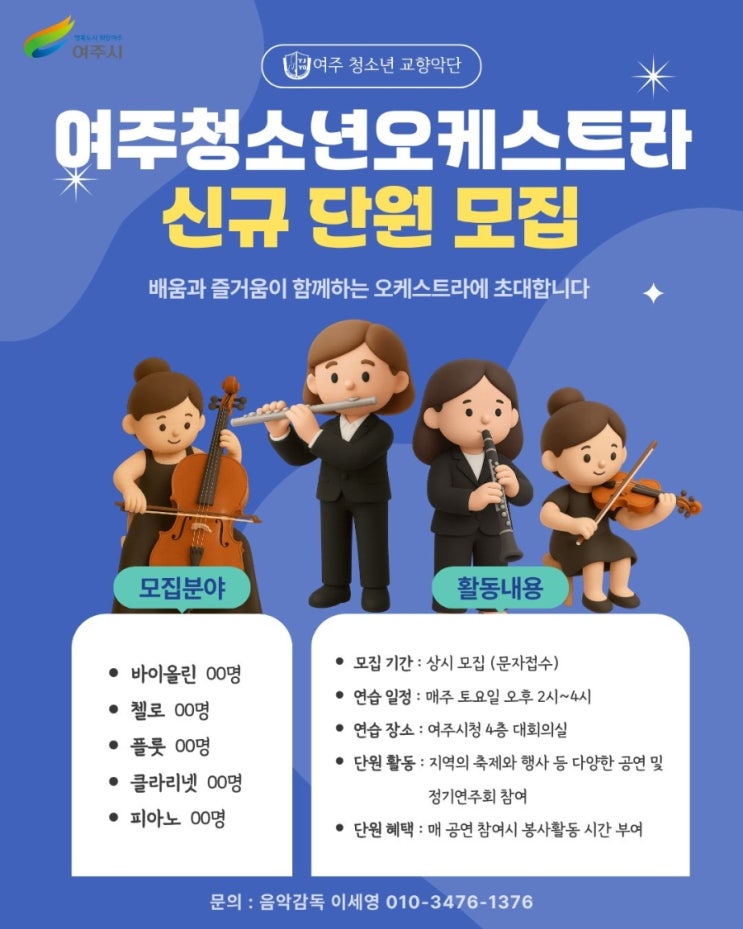 [2026 여주청소년오케스트라 신입단원 모집] ●활동 일시: 매주 토요일 2시~4시 여주시청 4층 대회의실 (1시간 파트연습, 1시간 합주) ●활동 내용: 매주 연습 및 지역 행사와 축제, 정기연주회 참여 ●단원 혜택: 공익 목적의 비영리 공연 참여시 마다 봉사시간 부여 2026년도 부터 함께하게된 지휘자님께서 tvn과 넷플릭스의 청춘드라마 [포핸즈]에서 이준영 배우의 지휘 대역으로 출연하게 되었습니다☺️ 젊고 능력있는 열정적인 지휘자님과 함께 긍정적인 에너지가 가득한 청소년 오케스트라로 청소년 여러분을 초대합니다☘️ [상임지휘자 김영준] 덕원예술고등학교 작곡, 지휘 복수 전공 서울학생음악콩쿨 피아노 부문 은상 한국예술....... <img src="https://blogthumb.pstatic.net/MjAyNjAzMDZfMTYg/MDAxNzcyNzkyMDQ1NzI4.JJKjxzJ8YNh2LczsYsHqj5Vk0Z2ycWr4Mfzzjrk22xwg.Y-eftuofUY19eJnxPkOpUoG8kNeN-OWlNidlsvqDF8og.JPEG/900%A3%DF2026_%C3%BB%BF%C0_%B4%DC%BF%F8%B8%F0%C1%FD_%A3%A84%A3%A9.jpg?type=s3" />