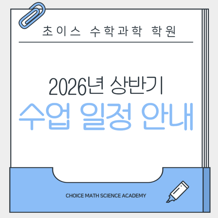[2026학년도] 초·중·고 학년별 수업 일정 안내 안녕하세요! 우리 아이들의 확실한 실력 향상을 책임지는 초이스 수학과학 학원입니다. 2026년 새 학기가 시작하면서 학부모님들의 문의가 많아, 현재 확정된 주요 학년별/과목별 큰 틀의 시간표를 안내드립니다. 꼭 확인해 주세요! 아래 안내된 시간표는 가장 비중이 큰 메인 수업 위주로 정리되었습니다. 요일별로 [기본+유형+응용], [기본+유형+응용+심화] 등 진행되고 있습니다. 우선 아래 내용은 큰 틀만 안내드립니다. 학년별 수업 커리큘림 및 진도, 교재 이 외에 수준별 세부 분반, 특강 일정 혹은 시간표에 명시되지 않은 기타 수업에 대해서는 개별 상담을 통해 상세히 안내해....... <img src="https://blogthumb.pstatic.net/MjAyNjAzMDZfMjE3/MDAxNzcyNzc3ODQ0MTkx.7I8duF4lpqMDvdhoZLjv4JxcGf5qd1CvVEjzadBq1MYg.JiPl3YK-QW39ZyCpTIyNd5DKJxlJQZRo-HBROtNa_OQg.PNG/%C1%A6%B8%F1%C0%BB_%C0%D4%B7%C2%C7%D8%C1%D6%BC%BC%BF%E4_-001.png?type=s3" />