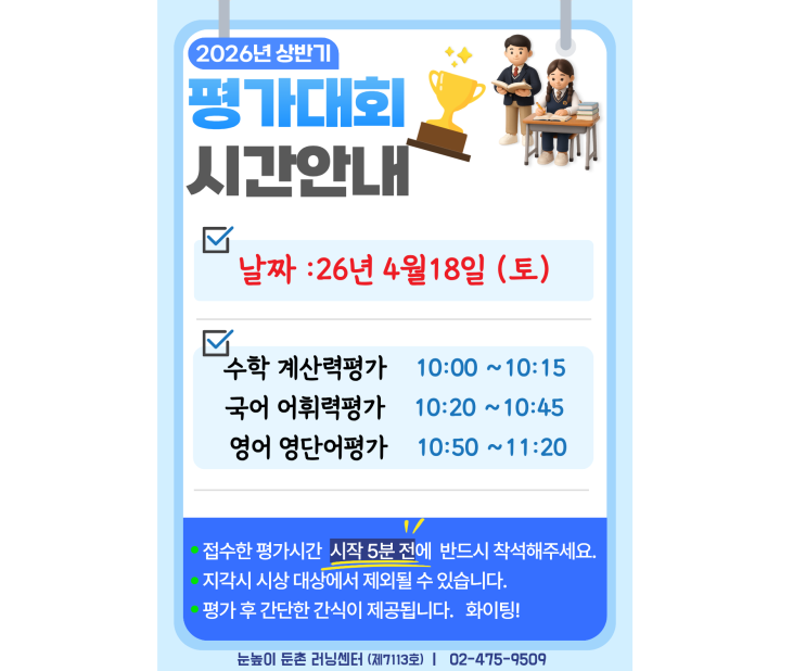 안녕하세요 <눈높이 둔촌학원>입니다~!!! 지난 주 토요일(4/18)에 눈높이 둔촌학원에서는 우리 친구들이 한달 넘게 준비한 <눈높이 둔촌학원 상반기 평가대회>를 진행했는데요~ 특히나 놀라웠던건 지난 평가때 보다 더 의젓한 자세로 진지하게 임해 준 우리 친구들의 발전된 모습!!!!! 넘나X1000000 칭찬합니다~!!!!! 평가 후 간식을 가지고 가는 우리 친구들 모습!!! 평가대회 준비하느라 우리 친구들, 둔촌학원 선생님들 너무 고생하셨습니다~ 다음 글에서는 <눈높이 둔촌학원 상반기 평가대회> 시상식으로 찾아 뵙겠습니다~~ <img src="https://blogthumb.pstatic.net/MjAyNjA0MjBfOTMg/MDAxNzc2NjcwMzk1ODky.f3fV11kCOwKFD_Y4ynk6LdAlAwMNKQLBJbwNpmHVGFkg.KRSGj4sLaLkyCyhSg7tnOLuIUdV7EdOlntbTsAOFNv0g.PNG/image.png?type=s3" />