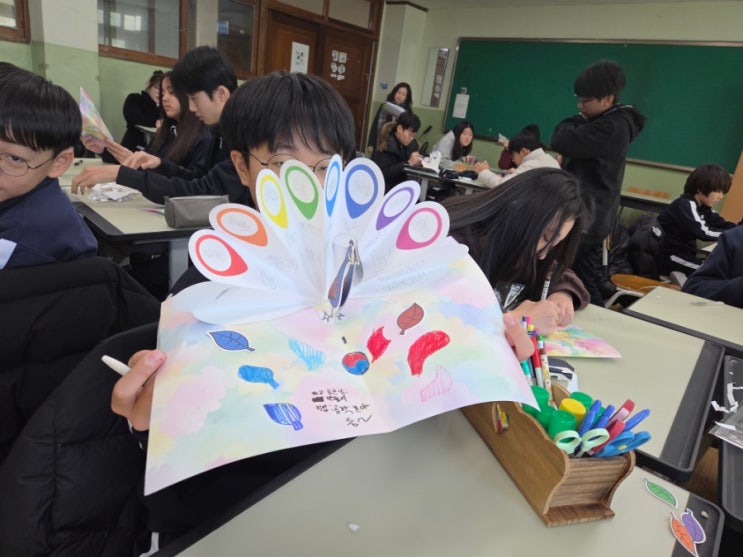 공작새의 날개가 활짝피듯 우리 아이들의 꿈도 활짝 피기를 바라는 마음을 담아 준비한 수업이다. 무지개색에 나의 꿈 일곱가지를 적어보고 그 꿈이 갖는 의미도 함께 적어본다. 그리고 그 중 가장 이루고 싶은 꿈을 선택하고 그 꿈에 대한 내용을 좀 더 구체적으로 적어본다. 그 꿈을 다른 사람과 공유할 수 있는 방법을 써본다. 중학생을 대상으로 하는 수업은 조금은 더 힘이든다. 그림책을 읽어주고 만드는 팝업북은 그래도 관심을 갖는다. 수업에 참여한 아이들 100%가 다 이해하고 공감하고 느끼는 수업이 되긴 어렵다. 그러나 이 수업을 통해 자신에 대해 잠시라도 생각하는 시간을 갖게 된다면 나는 그것으로 족하다. <img src="https://blogthumb.pstatic.net/MjAyNjAxMTZfMjcw/MDAxNzY4NTYxMzkxMzE0.3nzJ3JReY47nbx2KgIt3maJPp-odHZDApvKZz4Erppgg.W1_8zdJscYZJR5YODy2_n-19ZJH1F5mvUd78d21poPwg.JPEG/900%A3%DF20251230%A3%DF104840.jpg?type=s3" />