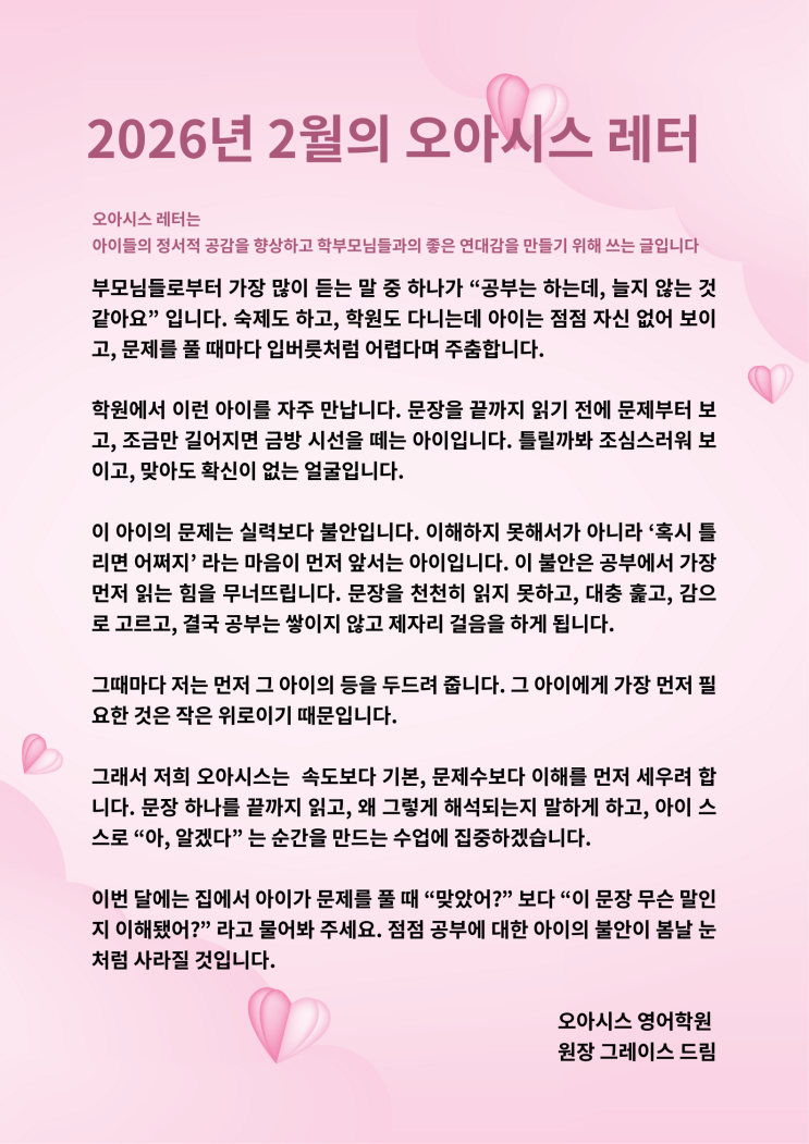 안녕하세요, 대교 눈높이입니다 우리 아이 영어 학습을 하다 보면 이런 고민 한 번쯤 해보셨을 거예요. “단어는 외우는데, 글을 읽으면 이해를 못 해요.” “문법은 배웠다는데, 문장은 왜 안 될까요?” “듣기는 더 어려워요…” 초등 영어에서 가장 많이 생기는 불안은 열심히 했는데 실력이 쌓이지 않는 느낌입니다. 그 이유는 영어를 ‘부분별로’만 공부했기 때문입니다! 초등 영어, 왜 불안해질까요? 초등 시기 영어 학습에서 가장 흔한 문제는 단어, 문법, 듣기가 서로 연결되지 않은 상태로 진행된다는 점입니다. 단어는 많이 아는데 지문을 읽으면 의미가 잘 안 잡히고 문법은 배웠지만 독해에 적용되지 않으며 듣기는 따로....... <img src="https://blogthumb.pstatic.net/MjAyNjAxMTNfMzcg/MDAxNzY4MjY5MTM4MDk3.f8ho0ITRhembe7Mc8NWf7oScVvzTEIfz8fhExmgDAMIg.7LbKUpOVKMwpAYgmIBcszR8gfG2IpyiRu8Vx50aK6u0g.PNG/1-LC.png?type=s3" />