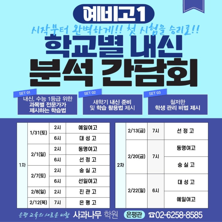 교육 특구 25년 노하우 입시 명문 은평 교육의 새로운 바람 사과나무 학원 [은평관]입니다. 시작부터 완벽하게 첫 시험을 승리로!!! 고등학교 3년의 성적은 첫 시험에서 이미 흐름이 결정됩니다. 나에게 맞는 고등학교 제대로 알아보기!!! 사과나무 [은평관]에서 학교별 내신 특징을 분석한 예비고1 내신 간담회를 진행합니다. [예일여고 / 대성고 / 동명여고 /선정고 /숭실고 / 선일여고 / 진관고 / 은평고] 내신분석 간담회 ✔ 참여 대상 : 중3[예비고1] ✔ 일시 : 학교별 상이 ✔ 장소 : 사과나무학원 [은평관] ✔ 발표 연사 : 고등 전임 강사진 사과나무는 매년 많은 예비고1 학생들을 고등 첫 내신 상위권으로 이끌며 결과로 신뢰를 쌓....... <img src="https://blogthumb.pstatic.net/MjAyNjAxMjRfMjU3/MDAxNzY5MjI1NDMyNDQ0.BmnfX-a97A5rBNBRydhndUhd4KkAvck5MeMxlmqiqGgg.tgnW4nXtYiUZkc2rLXCW0IHFeZNwMn-nLqnKZ3U6054g.JPEG/26.1%BF%F9_%B3%BB%BD%C5%B0%A3%B4%E3%C8%B8_03.jpg?type=s3" />