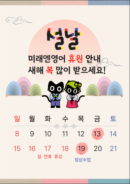 안녕하세요❤️ 영어로 미래를 꿈꾸다! 미래엔입니다. 2026년 새해가 밝았습니다. 올 한 해도 학부모님 가정에 건강과 행복이 가득하시길 진심으로 기원합니다. 지난 한 해 동안 아이들의 성장을 믿고 맡겨주셔서 진심으로 감사드립니다. 아이들이 한 걸음씩 영어에 자신감을 갖고 성장해가는 모습을 보며 저 또한 큰 보람을 느끼고 있습니다. 다가오는 설 명절, 사랑하는 가족과 함께 따뜻하고 풍성한 시간 보내시길 바랍니다. 아이들에게도 웃음 가득한 행복한 명절이 되기를 바랍니다. 설 연휴 휴원 일정 안내 ▶ 휴원 기간 : 2월 16일 ~ 2월 18일 ▶ 정상 수업 시작 : 2월 19일(목) 연휴 동안 재충전의 시간 보내시고, 이후 수업에....... <img src="https://blogthumb.pstatic.net/MjAyNjAyMTNfMTc1/MDAxNzcwOTkwMzY5MTU3.5DQQT-t7HzXf_jQAYtXHHBi8fjRl9b2U5JQwCXRCXX8g.habXC0C2FpcnzWI5QkJwZ94auIJe4M31aXAEVm-8IHwg.PNG/%BD%BA%C5%A9%B8%B0%BC%A6_2026-02-13_121219.png?type=s3" />