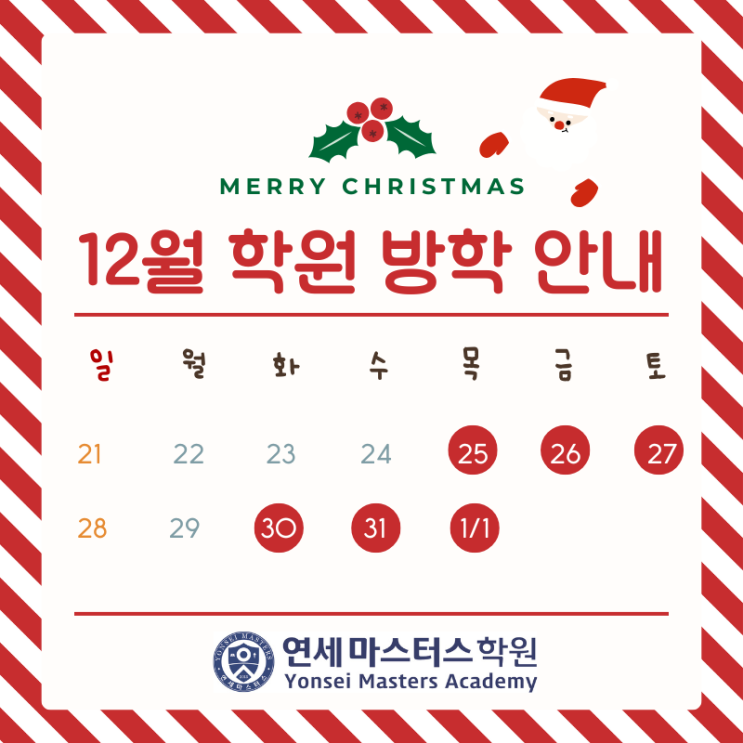 안녕하세요. 연세마스터스학원입니다 다가오는 크리스마스와 연말을 맞아 12월 학원 방학 일정을 안내드립니다. 방학 기간 12월 25일 (목) ~ 1월 1일 (목) ⚠️⚠️ 12월 29일 (월)에 월금반 친구들은 수업이 있습니다 ⚠️⚠️ 한 해 동안 열심히 공부해 준 연마인들이 잠시 숨을 고르며 가족과 함께 따뜻한 연말을 보낼 수 있는 시간이 되기를 바랍니다 방학 이후에는 더욱 알찬 수업과 다음 학년 대비를 위한 체계적인 학습으로 다시 만나겠습니다. 메리 크리스마스 & 해피 뉴이어 즐거운 성탄절과 행복한 새해 되세요! #연세마스터스학원 #연마학원 #12월학원방학 #겨울방학안내 #크리스마스방학 #연말연시....... <img src="https://blogthumb.pstatic.net/MjAyNTEyMjNfMTQ2/MDAxNzY2NDg2MzE4NjM2._6yiXg5s20SbZasGzGXuIMMCOImpF9foNgkCX7BQlFgg.npiQA4BIqyfebLQwMeYZTdv2gVAaXc7gfT4Rmh---NAg.PNG/%BC%F6%BE%F7%C0%CF_%BE%C8%B3%BB.png?type=s3" />