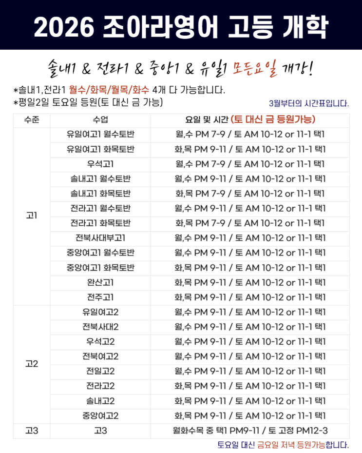 안녕하세요 조아라영어전문학원입니다. 솔내1,전라1,중앙1,유일1 모든요일 수업 개설하여 안내드립니다. <솔내1,전라1,중앙1,유일1 시간표 안내> 1. 월화수목 중 2일 선택 ex) 월수, 화목, 월목, 화수(월수 OR 화목 가장 추천) 2. 토 아침 10시 or 11시 선택 *토요일 대신 금요일 저녁 등원 가능 <전체 시간표 안내> 1학년 : 솔내/전라/중앙/유일/우석/전북사대/전주고/완산고 2학년 : 솔내/전라/중앙/유일/우석/전북사대/전일고/전북여고 아래 요일 및 시간대 참고 부탁드립니다 :) <img src="https://blogthumb.pstatic.net/MjAyNjAxMjBfMTU5/MDAxNzY4OTAyMzgxMjA0.JYJG_OGxkk9wHf5kzQewuEiIUUE_SaqYN9gMI1icyKgg.y_A88IeiLkShTrPwb4s_SxuhXBI4t6y_Lnu5-WfEQ_cg.PNG/%BD%C3%B0%A3%C7%A5_%BA%B9%BB%E7%BA%BB-002_%283%29.png?type=s3" />