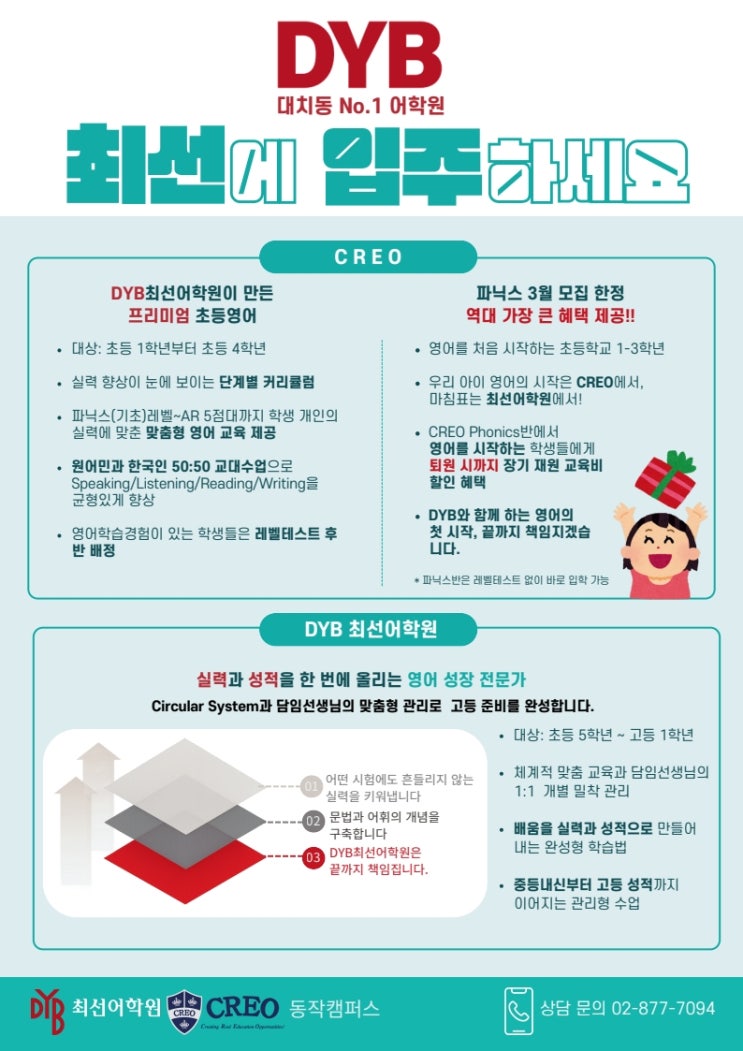 ⭐ CREO PHONICS CLASS 개강 안내 ⭐ 영어의 첫 단추, 파닉스 CREO가 아이들의 영어 첫걸음을 탄탄하게 만들어 드립니다 CREO PHONICS CLASS는요 1️⃣ 알파벳부터 소리 규칙까지 체계적인 파닉스 학습 2️⃣ 듣기·읽기·말하기의 기초를 동시에 잡는 수업 3️⃣ 영어가 처음인 아이도 자신감을 키울 수 있는 커리큘럼 아이의 영어 시작, CREO가 함께하겠습니다. 모집 대상 ⊙ 현 초등 1~3학년 수업 시간 ⏰ 매주 월·수·금 오후 2:30 ~ 4:00 (2교시 수업) 영어의 시작부터 고등까지, 끝까지 책임지는 영어 교육 DYB 최선어학원 동작캠퍼스 입니다. 문의는 언제든지 편하게 주세요 <img src="https://blogthumb.pstatic.net/MjAyNjAxMjNfMTMy/MDAxNzY5MTQ4NzAzMzkx.RgVr2bj047rEIddi4Sj8yQLY2gOhxqh3zp-vkeSgW0Ig.Gu29-DOiQKVtzWl1M1SLrk5YWdmmqzCWMf-31pwzAfIg.JPEG/KakaoTalk_20260122_201030199.jpg?type=s3" />