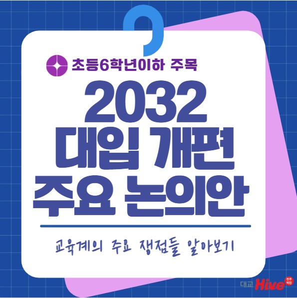 학부모님께 알찬 교육 정보를 전해드리는 대교 전주 덕진 하이브입니다~ 이번 글에서는 하루가 다르게 변화하는 교육 정책 때문에 고민이 많으신 초등 학부모님에게 요즘 논의되고 있는 교육계의 이슈를 바탕으로 우리 자녀들이 길러가야 할 역량을 소개 드리려고 해요~ 요즘 뉴스에서 '2028 대입'에 이어 '2032 대입 개편' 이야기까지 나오면서 혼란스러우신 분들이 많으실 거예요. 그래서 입시 전문가 이만기 소장님의 분석을 바탕으로, 현재 초등학교 6학년 이하 아이들이 겪게 될 <2032 대입 개편 논의안>의 핵심 쟁점들을 정리해 드리려고 합니다. 2028 대입 vs 2032 대입, 무엇이 달라지나요? 2028 대입 (현 중....... <img src="https://blogthumb.pstatic.net/MjAyNjAxMjNfODcg/MDAxNzY5MTI5NTk4Mzkx.uFiBsBZs8wSu9rszIqN2gdPxjG-64Vr6wtTYWLw-xZgg.-dI9wOXCR76hRdTcGoaUaLwIbTbVMfpVEV3G3M1MiU4g.JPEG/%C8%AD%B8%E9_%C4%B8%C3%B3_2026-01-19_221848.jpg?type=s3" />