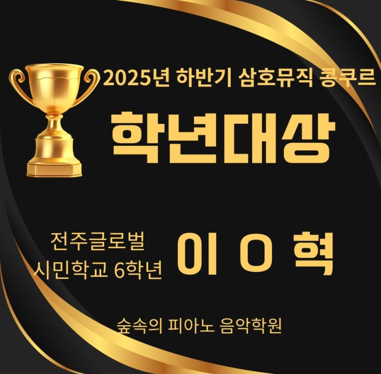 안녕하세요. 오늘은 정말 기쁜 소식을 전하려고 합니다. 숲속의피아노음악학원 이0혁 학생이 삼호뮤직콩쿠르에서 학년대상을 수상했습니다. 콩쿠르를 준비하면서 단순히 곡을 연습하는 것을 넘어 음악을 이해하고 표현하는 힘을 키우는 시간들이었습니다. 수업 시간마다 한 음, 한 프레이즈를 어떻게 표현하면 좋을지 함께 고민하며 연습해 왔는데 그 과정 속에서 학생의 연주가 점점 깊어지는 것이 느껴졌습니다. 무대 위에서는 긴장도 되었을 텐데 끝까지 집중하며 자신의 음악을 잘 들려주었고 그 결과 학년대상이라는 값진 결과로 이어졌습니다. 무엇보다 이번 콩쿠르를 준비하면서 연주에 대한 자신감과 음악적인 표현력이 한....... <img src="https://blogthumb.pstatic.net/MjAyNjAzMDNfMjk4/MDAxNzcyNTMxNzMzODkw.Jel6BUfW3TxeQB0ybKQUqiqzYVCsd6RctG6HM0F9UrMg.53MMHrK81h4v4oBUvAo6yj6GI-eMN3ULAQpc6bWbdecg.JPEG/Gold_and_Black_Luxury_Background_Instagram_Post.jpg?type=s3" />