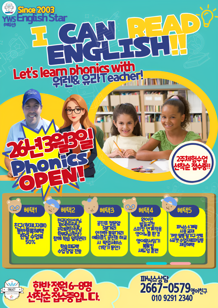 24년전통 명문영어 YWS(예우선) English Star 26년 3월 신학기 첫 파닉스반 오픈합니다^^