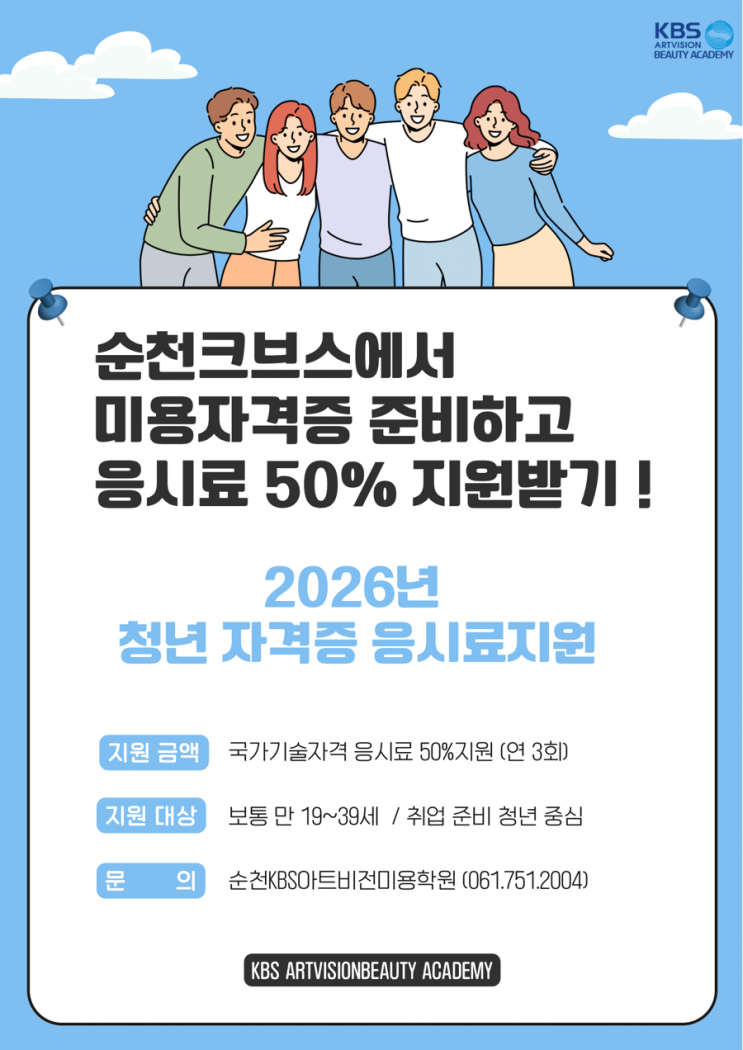 안녕하세요 순천 KBS미용학원입니다! 요즘 미용 국가자격증을 준비하는 분들 정말 많으시죠? 저희 학원에서는 자격증 취득 + 비용 부담까지 줄일 수 있는 좋은 기회가 있어서 소개드리려고 합니다 2026년 청년 자격증 응시료 지원 미용 국가자격증 준비하시는 분들이라면 꼭 주목해주세요! ✔ 국가기술자격증 응시료 50% 지원 ✔ 연 최대 3회까지 지원 가능 자격증 시험 비용도 부담이 될 수 있는데 이렇게 지원까지 받으면서 준비할 수 있는 기회라 더욱 좋은 것 같아요 지원 대상 ✔ 만 19세 ~ 39세 청년 ✔ 취업 준비 중인 분들 우선 미용 분야로 진로를 고민하고 계신 분들이라면 지금 시작하기 딱 좋은 타이밍입니다....... <img src="https://blogthumb.pstatic.net/MjAyNjA0MjhfMjgy/MDAxNzc3Mzc1NTQzNTAy.6DVHuFu1Jo8O4aVY0hXr0ZFa7Eu_0-PhLU2ZvC8Bnjsg.wNr831Cj1gyxFeTLy7S_WIH4Ro7Uq49itgnhw18A9xMg.PNG/IMG%A3%DF0891.PNG?type=s3" />