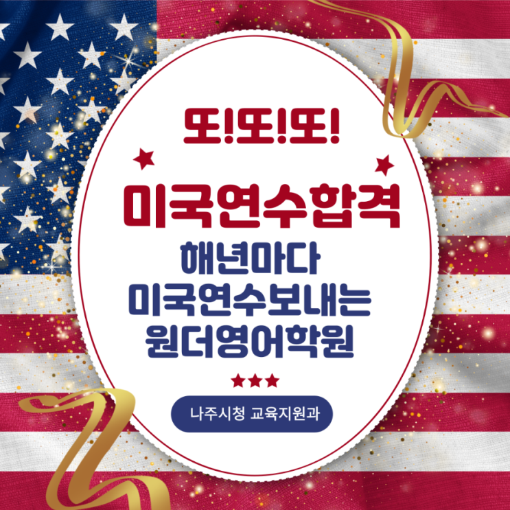 또 한 번 기쁜 소식을 전합니다! 저희 원더영어 학생이 나주시청 교육지원과에서 주관하는 미국 연수 프로그램에 합격했습니다. 이 프로그램은 매년 나주시에서 영어로 우수한 중학교 2학년 학생들을 선발하여 미국 현지 영어 문화 체험의 기회를 제공하는 뜻깊은 공교육 연수예요. 학생 1인당 연수 비용의 50%를 나주시에서 지원해 주기 때문에 매년 경쟁률이 상당히 높습니다. 그런데 올해도, 저희 원더영어 학생이 그 어려운 기회를 당당히 잡았습니다. 영어는 단순히 ‘시험을 위한 공부’가 아니라 세상과 소통할 수 있는 언어라는 믿음으로 꾸준히 ‘소리 중심 영어 학습’을 이어온 결과라고 생각합니다. 특히 나주시가 지역 학....... <img src="https://blogthumb.pstatic.net/MjAyNTExMTdfMjk4/MDAxNzYzMzg4ODI4Njg0.LKa3RYK3vW-D1GAfIplB2KkBJc2QXvdTEst_H5HIGWUg.BPu728C1eAC6_v3gu17R70tpU-Ba1F6KQNzKcpUdi60g.PNG/900%A3%DF%C1%A6%B8%F1%C0%BB%A3%AD%C0%D4%B7%C2%C7%D8%C1%D6%BC%BC%BF%E4%A3%DF%A3%AD001%A3%AD102.png?type=s3" />