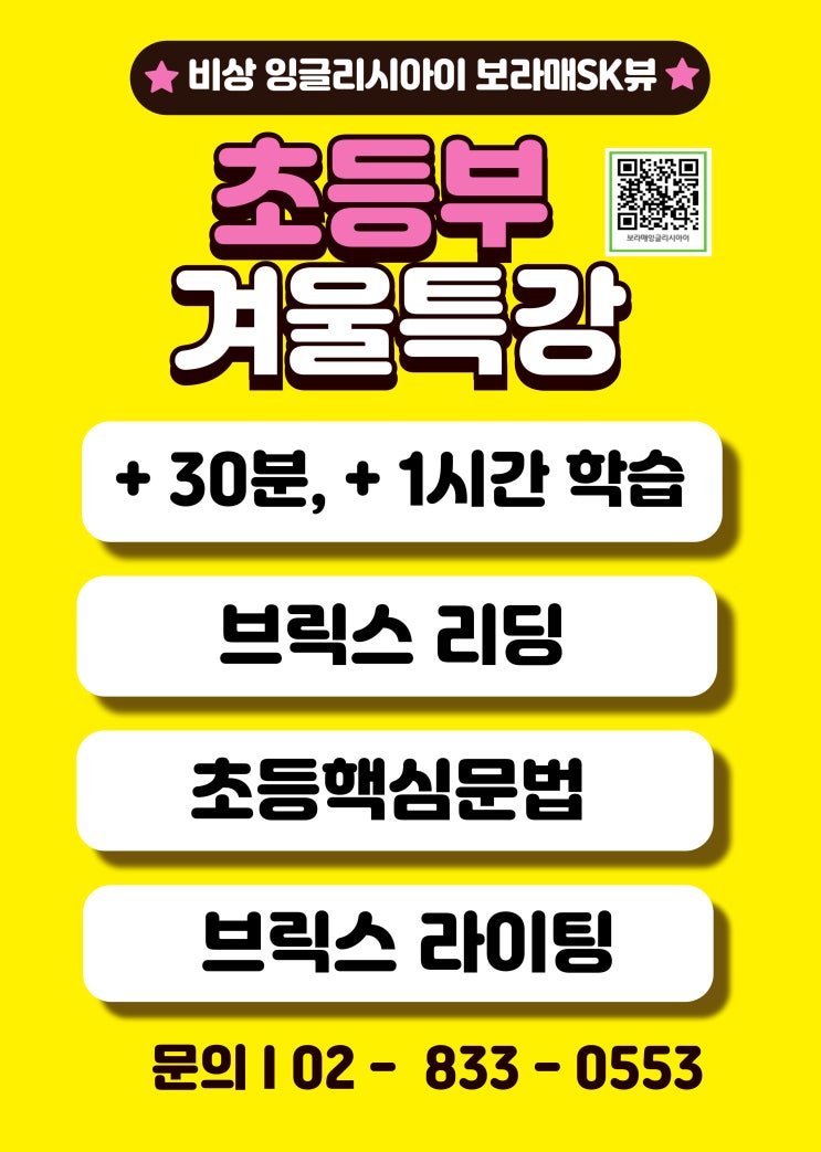 안녕하세요~! 신길동 영어학원 영어교육 전문가 레이나T입니다. 오늘은 겨울방학 특강 안내 드릴께요~! 1. 초등부 겨울특강 초등부 특강은 4종류를 준비했어요. 첫 번째 특강은 +30분, +1시간 학습인데요. 이 특강은 재원생들을 위한 특강이에요. 학기 중에 바빠서 자주 등원하지 못했던 학생들이 방학동안에 정규수업에 30분이나 1시간 추가하여 수업을 합니다. 방학 때 몰입수업과 진도를 나가기에 좋은 특강입니다. 시간은 재원생들 정규수업에 맞춰서 진행됩니다. 두 번째 특강은 브릭스 리딩특강이에요. 초등 저학년부터 고학년까지 들을 수 있는 수업이고, 문장읽기가 가능해야 합니다. 방학동안 독해실력을 늘리고 싶은 학생들에게 추전합....... <img src="https://blogthumb.pstatic.net/MjAyNTEyMTJfMTY3/MDAxNzY1NTE3NjEyMzgw.RmyZoiaUZjpUvWPg20_guw6LCZPHuBTc-36dfGEHIg8g.CWQqqZl3l6KNLZzvtkw2N1_rnAPlpggnX8YBZb62qTsg.JPEG/%B0%DC%BF%EF%C6%AF%B0%AD-012.jpg?type=s3" />