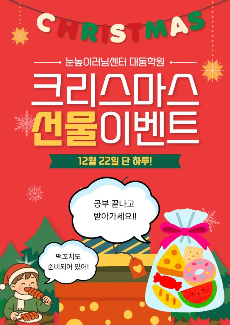 안녕하세요 아이들의 즐거운 배움이 이어지는 눈높이 러닝센터 대동학원입니다. 아이들과 함께 따뜻한 추억을 만들고 싶어 12월 크리스마스를 맞아 작은 이벤트를 했었습니다! ✨ 이벤트 기간 12월 22일(월), 단 하루! 짧지만 알차게 준비한 이번 크리스마스 행사는 아이들에게 공부의 즐거움과 성취감을 함께 전해주는 시간이었답니다 수업 시간 동안 집중해서 공부하고 열심히 참여한 친구들에게는 간식 꾸러미 선물! 초콜릿, 과자 등 맛있는 간식에 아이들이 특히 좋아한 떡꼬치까지 공부 후에 먹는 간식이라 그런지 더 맛있게 느껴졌던 하루였어요 강성유치원, 대동병설유치원 친구들도 “열심히 하....... <img src="https://blogthumb.pstatic.net/MjAyNjAxMjBfMTIz/MDAxNzY4OTA5MzU1NTEy.7JnAUEqUyPyZ7-_ACLiqM54ykowDbi6BLJ2Lli3cgnsg.BjfZvkvfgsZxTFC5PCzYIKI8_LsDbL-RGz60dqILX7wg.JPEG/KakaoTalk_20251222_142242098.jpg?type=s3" />