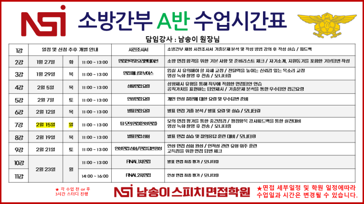 안녕하세요, 남송이스피치면접학원입니다. 우리 소방간부 수험생 여러분들이 그토록 치열하게 준비해온 제32기 소방간부후보생 선발 필기시험이 이제 정말 얼마 남지 않았습니다. 지금 이 글을 보고 계신 수험생분들, 막판 스퍼트를 올리느라 긴장도 되고 걱정도 많으실 텐데요. 오늘 포스팅에서는 시험 당일 당황하지 않도록 반드시 숙지해야 할 필수 정보를 깔끔하게 정리해 드리고, 시험 이후의 로드맵까지 제시해 드리려 합니다. 잠시 머리도 식힐 겸, 중요한 내용만 쏙쏙 확인하고 가세요! 1. 2026년(제32기) 소방간부 시험, 핵심 일정 Check! 가장 중요한 날짜와 시간, 다시 한번 머릿속에 각인시켜 볼까요? 필기시험 장소 공고: 1월 7일(수....... <img src="https://blogthumb.pstatic.net/MjAyNjAxMTVfMTQ3/MDAxNzY4NDczMDEzOTIy.wBo9OKy2_YPhw3QMEg6nKEhDyxNLigrYZIFc8TD4MKkg.t9LQEEKUtQveihrpeyHaAXsys2ahwdHy8Cmp6W2kDVYg.PNG/%BD%BD%B6%F3%C0%CC%B5%E51.PNG?type=s3" />