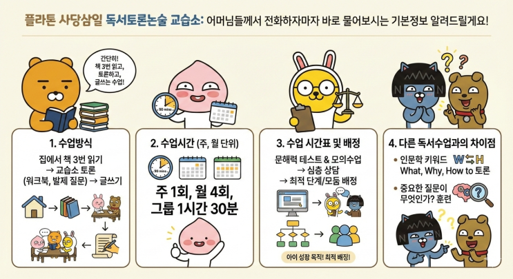 이수 사당동 플라톤 사당삼일 독서토론논술 교습소입니다. 어머님들께서 전화하자마자 바로 물어보시는 기본 정보 알려드릴게요! 1. 플라톤 사당삼일 독서 토론 논술 교습소의 수업방식 전화 오시는 대부분은 학부모님들은 독서 관련 수업을 해보지 않으셨다. 어떻게 진행하는지를 물어보시는데, 그러면 나는 이렇게 대답한다. "간단히 말씀드리면, 집에서 책을 3번이상 읽고 교습소에 있는 워크북과 제가 연구, 발제한 질문들을 가지고 토론을 한 후 그 주제를 가지고 글쓰기를 해보는 수업입니다." 2. 수업 시간, 주, 월 단위 수업 시간은 주 1회, 월 4회, 그룹 수업 시 1시간 30분. 3. 수업 시간표 및 시간 배정 아이가 읽는 책의 난....... <img src="https://blogthumb.pstatic.net/MjAyNjAxMjNfMTQw/MDAxNzY5MTYyNzUyNDYx.TOPEHdVkhgkNIuhCB4tAOxOmQ_CgDF2h-qgdH7YY2Vog._S2pr4vTuQJSA1UHYVBwY96MSpjoQVGMjjYDDckbgukg.PNG/Gemini_Generated_Image_uvbsxouvbsxouvbs.png?type=s3" />
